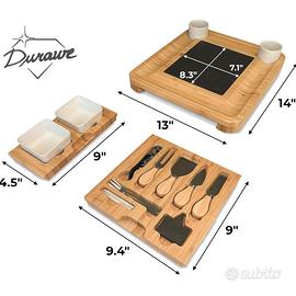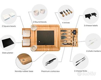 ✔️SET DI QUALITÀ PREMIUM: Il tagliere da portata in legno include un cassetto estraibile con set di posate e utensili da cucina come 4 coltelli in acciaio inossidabile di alta qualità con manici in bambù, 1 tavola extra per inserire i vassoi in ardesia per servire carne/formaggio, 2 forchettine a due punte , 2 ciotole di ceramica per salse, 2 ciotole per noccioline, pistacchi, mandorle, anacardi, arachidi, nocciole, olive, 2 pennarelli, 2 vassoi in ardesia e apribottiglie di qualità superiore. 🎉PERFETTO PER OGNI OCCASIONE: Il tagliere per formaggi in bambù con utensili da cucina è ideale per tutte le occasioni: vacanze, barbecue, matrimoni, feste di laurea, compleanni, anniversari, Natale, Ringraziamento, festa della mamma, festa del papà, San Valentino, ecc. È un'idea regalo perfetta per l'inaugurazione di una nuova casa! 💎RESISTENTE E FACILE DA PULIRE: Utilizziamo bambù di altissima qualità al 100% naturale per aiutarti a condurre uno stile di vita più sostenibile. Il set è in legno ed è ecologico. I vassoi in ardesia e bambù non solo sono esteticamente molto gradevoli, ma non danneggiano il nostro pianeta! Il tagliere si pulisce facilmente dopo l’uso per renderlo subito pronto per la prossima festa. Non lavare in lavastoviglie! 🎁VALORE AGGIUNTO: Il nostro tagliere/vassoio da portata in bambù si caratterizza per un design unico ed è dotato di un grande vassoio in ardesia che aumenta lo spazio e lo proteggere dai possibili tagli! La bella confezione e la lavorazione di qualità rendono questo tagliere per salumi un'idea regalo perfetta per tutti. Stupisci i tuoi amici o familiari con il pratico tagliere in bambù con ciotole e set di coltelli! Nuovo, mai usato Consegna a mano in zona crocetta o spedizione disponibile