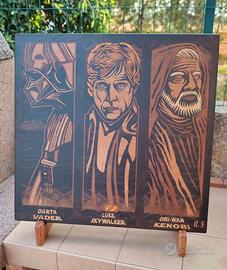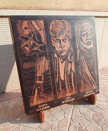Intarsio artistico in legno – Tributo alla saga di Star Wars Questa opera unica celebra tre icone della galassia lontana: Darth Vader, Luke Skywalker e Obi-Wan Kenobi. Realizzata interamente a mano con la tecnica dell’intarsio, il tagliere è composto da 7 tipi di legno naturale, incastonati su una base in Noce Americano lavorato di controvena, per un effetto visivo ricco e tridimensionale.