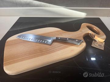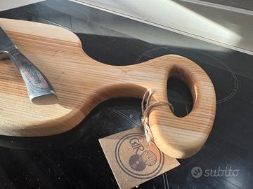 Tagliere in legno massello di frassino. Fatto a mano, con colla ad uso alimentare e trattato con olio, Nodi stuccati con resina epossidica atossica. Misure, larghezza 23 cm, lunghezza con manico 48 cm. Spessore 2,5cm. Durevole nel tempo. Realizzato nella mia piccola attività da hobbista