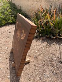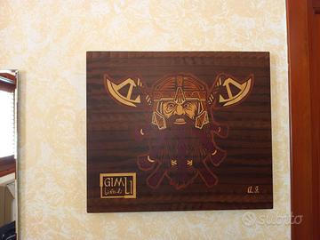 Un’opera d’arte in legno che celebra Gimli, il leggendario nano della saga Il Signore degli Anelli. Questo pannello intarsiato è realizzato con sei essenze lignee naturali: Acero Americano, Okumè, Faggio, Osage Orange, Cuore Viola e Noce Americano, incastonate con precisione su una base in Noce Americano lavorato di controvena.