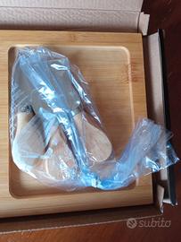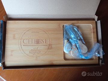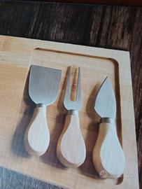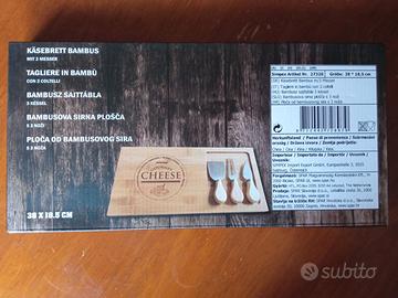 Tagliere in legno 100% organico (prodotto naturale) per servire il formaggio con le posate adeguate per tagliarlo e servirlo, con dimensioni 38 x 18,5 cm. Mai usato in scatola originale e utensili dentro del sacchetto in plastica intatto.