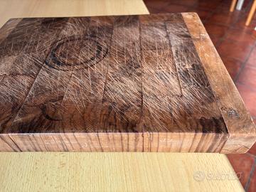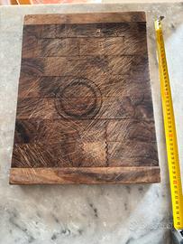 Tagliere professionale PL410 in radica di ulivo con n. 4 tiranti in acciaio serrabili con brucole, uasto ma in ottimo stato, non deformato, normale usura per tagli con coltello. Misure: 40,00 x 29,50 cm, spessore 4,00 cm peso 1,75 kg.
