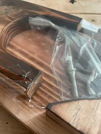 Tagliere in legno per prosciutto con i blocchi avanti e dietro in acciaio. Coltello deducayo al rahlio dei prosciutti compreso.