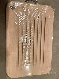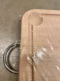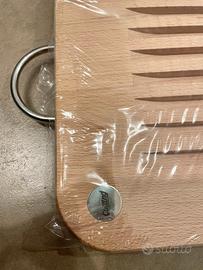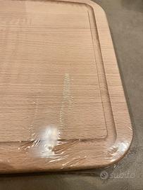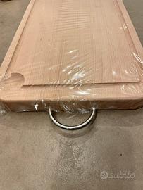 Tagliere rettangolare in legno chiaro con borso intagliato. Si tratta di un tagliere di ottima qualità, spesso e pesante, perfetto per la cucina. Mai usato e ancora nella sua pellicola originale. Marca: Cutting beltrame Dimensioni: 37cmx25cmx3cm