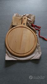 Tagliere rotondo in faggio listellare, perfetto per servire pizze o antipasti. Presenta un design classico con un bordo e un manico per una facile presa.