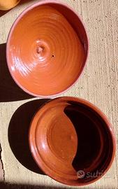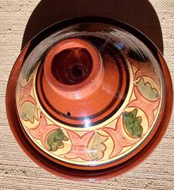 Tajin, marrone chiaro con disegno, ceramica alto 23 cm, diametro 30 cm Questo bellissimo Tajin grande per cottura cibi, è senza usura o ammaccature in quanto usato esclusivamente come oggetto decorativo. Prezzo € 50,-