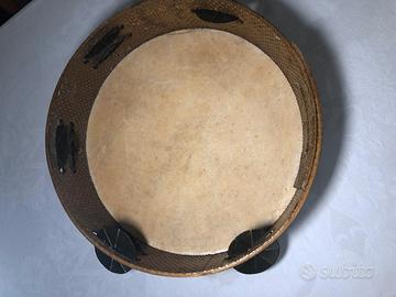 Vendo tamburello decorativo in legno con sonagli, dipinto a mano con un suggestivo paesaggio marino raffigurante una costa con case, mare e montagna sullo sfondo. L’oggetto è firmato dall’artista ed è ideale sia come elemento d’arredo che come souvenir artistico. Caratteristiche: Struttura in legno con pelle tesa e sonagli metallici Dipinto a mano con colori vivaci e dettagli in rilievo Firmato sul fronte Può essere appeso al muro o esposto come decorazione Diametro medio, leggero ma solido Condizioni: buone, con normali segni del tempo sulla pelle e sul retro, ma il dipinto è ben conservato