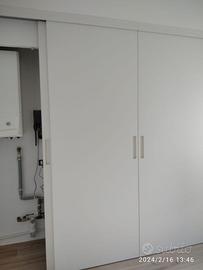 4 ante scorrevoli sospese con misura da circa 92 (cadauna) larghezza h 260 circa spessore 3 cm disposte con telaio interno in legno di toulipier con relativi traversi verticali e orizzontali uniti tra di loro in cui sulle spalle verticali troveremo raddrizzanti da incasso idonei per poter registrare anta con nido d’ape parte interna e rivestito con pannello in mdf ambo i lati in modo da avere una superficie idonea dritta liscia e la laccatura che verrà fatta sia perfetta ed omogenea. troveremo 2 ante + sporgenti (parte centrale) e le 2 rientranti verso interno nicchia in modo da poter sfruttare + spazio possibile all’interno della nicchia. Fresata gola ricavata sul pannello in modo da poterle aprire a proprio piacimento, completo di binario superiore fissato su ns supporto in legno laterali (moraletto) il cui verrà fissato al trave e messo in bolla in modo da poterle far scorrere perfettamente e non gravare sul soffitto in quanto non portante, ammortizzate in chiusura e apertura le ante con squaletto parte sotto fissata a pavimento per dare direzionalità. Fasce dx e sx di tamponamento in modo da nascondere differenze tra muro soffitto e porte. Finitura laccata bianco opaco rall 9010. NON DISPONIBILE A MAGAZZINO, il prezzo si intende franco fabbrica con finitura escluso montaggio trasporto e iva. Commercianti affaristi o perditempo poco graditi. Possiamo costruirli su misura fattezza e disposizioni del cliente, siamo un laboratorio artigianale che costruisce su misura.