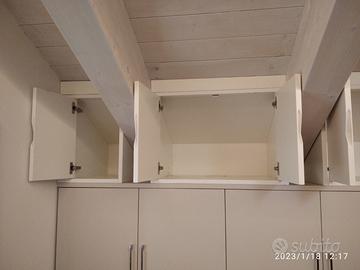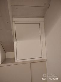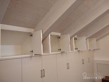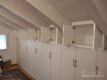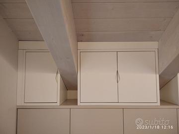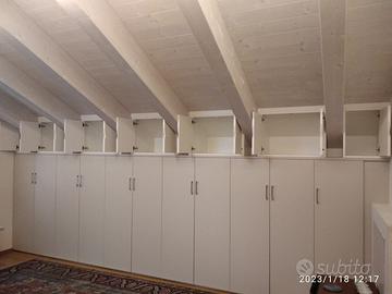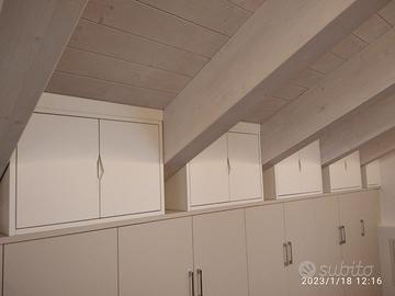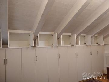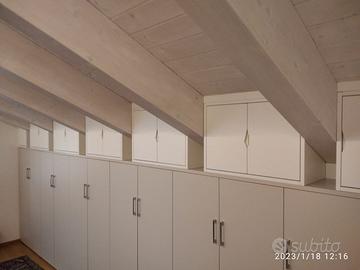 TAMPONATURA sotto tetto quantità 7 pensili (di cui 5 uguali doppi grandi e 2 singoli) costruiti tutti in listellare ricoperto di mdf idoneo per essere laccato uniformemente completo di schienale posteriore chiuso, uniti con apposita ferramenta spizzata in modo che andranno posti appena sopra armadio esistente fino al perlinato soffitto, con misura indicativa frontale 73 x 55 prof. 60 con frontale a 2 ante che si aprirà SU CERNIERE INTERNE REGOLABILI AMMORTIZZATE IN CHIUSURA E APERTURA TRAMITE FRASATA GOLA, vari tamponamenti superiori spizzati e i 2 laterali più piccoli fissati con ferramenta idonea. Finitura laccata coprente bianco rall 9010 opaco. costruito su commissione ed esigenze del cliente, non è disponibile a magazzino ma essendo i diretti produttori falegnami possiamo riprodurlo uguale o in base alle proprie esigenze. per domande o dubbi contattateci P.S. disponibili a dare suggerimenti o chiarimenti in merito, per noi conta dare vita al vostro sogno DIRETTAMENTE DAL PRODUTTORE ASTENERSI RIVENDITORI O COMMERCIANTI