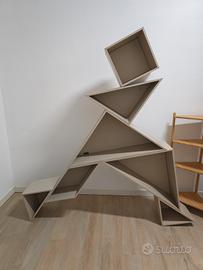 Offro DUE Tangram firmati da Daniele Lago. E' una libreria che nel suo design riprende un antico gioco cinese. L'oggetto è sempre lo stesso - un quadrato diviso in sette parti - ma le combinazioni sono infinite. Per praticità ho fatto fare due pannelli in compensato in modo da non dover fare molti fori sulla parete. Ma ogni elemento è staccabile per poter formare altre figure.