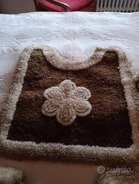 Tappeti bagno ,tre pezzi,marrone e avorio con disegno margherita ricorrente.Pelo folto e anti scivolo sul retro.Dimensioni ,per il più grande rettangolare cm.90x cm.50.Quelli sagomati cm.50 x50.Mai usati.