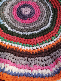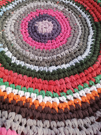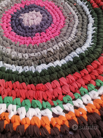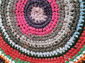 Tappeti fatti da me all'uncinetto con fettuccia di cotone, sono da rifinire attorno con il colore che voi preferite, li ho lasciati incompleti perché così posso procedere ad allargarli in base alle vostre esigenze di dimensione e di colore dominante