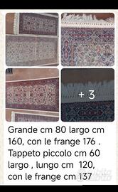 Vendo per trasloco tappeti tipo persiano trio. Il grande 0,80 cm x 1,60 /1,76 + i due piccoli 0,60 × 1,20/1,37, come nuovi Inoltre vendo tappeto persiano usurato e un po' rovinato agli angoliper esterno o per uso animali, misure Vedi foto in descrizione ..a 20 euro cadauno o prezzo trattabile Se presi in Lotto.