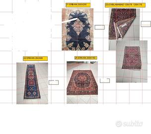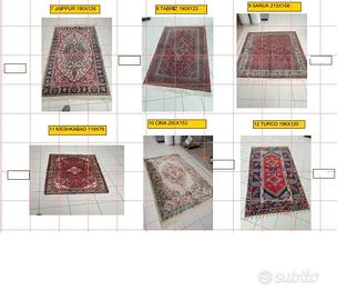 Vendo tappeti di molte misure a prezzo a partire dai 100 euro.Tutti e sottolineo tutti hanno ricevuto regolare manutenzione. Bellissimi per colori e finiture. Disponibile ad ogni informazione. Alcuni esempi in immagine. Prezzi eccezionali per tappeti di ottima finitura e qualità. Consiglio di approfittare.Il prezzo che esce in annuncio può non corrispondere ai tappeti in foto. preferita consegna a mano Si valuta vendita a blocco Sconti per vendita multipla Veri affari