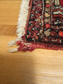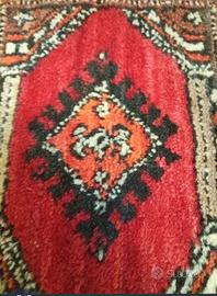 Piccolo tappeto vintage con un design intricato e frange su due lati. Perfetto per aggiungere un tocco di colore e stile a qualsiasi spazio. - Motivo centrale a rombo. - Bordi decorati con motivi geometrici. - Frange in tinta naturale. - Misura 30x28 + 2 cm di frangia - purtroppo un po' strappato come da foto. ⚠️⚠️ ATTENZIONE - Npn spedisco con Inpost ⚠️⚠️