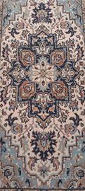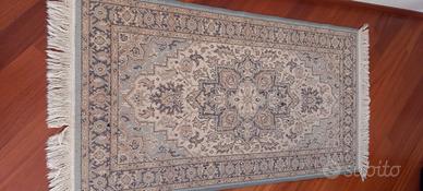 Tappeto a tessitura industriale, dimensioni cm 80×150 (frange escluse). Colori predominanti azzurro carta da zucchero e sfumature del marrone. Molto ben tenuto. Ritiro solo di persona