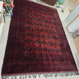 Vendesi Tappeto 'afghan fine' kunduz originale 3 m. x 2 m. annodato a mano, a trama fitta, vello e base in lana, frange grigie, compattezza dei nodi stretta, colore rosso cupo e bordeaux, decoro a ripetizione geometrica. Valore di mercato circa 3.000€