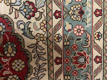 Caratterizzato da un medaglione centrale, motivi floreali dettagliati e una combinazione cromatica raffinata (rosso, beige, azzurro).