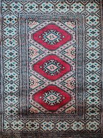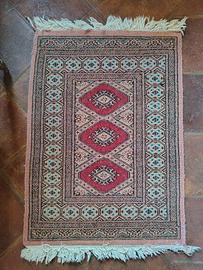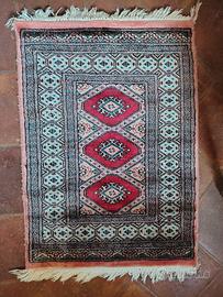 Tappeto orientale di formato piccolo, annodato a mano in lana, con disegno geometrico tradizionale su fondo rosso. Il tappeto è stato sottoposto a lavaggio professionale ed è pulito e igienizzato. Dimensioni: 64 × 89 cm.