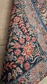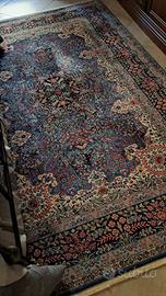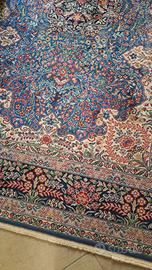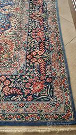 Tappeto Pakistano annodato a mano, con densità nodi alta. Colori ben conservati (blu/rosso/ avorio). Frange chiare (attualmente le ho ripiegate con scotch di carta, ma ci sono). Pelo in ottime condizioni generali. Misura 240 x 155