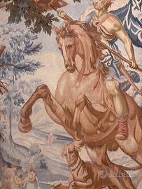 È un arazzo Aubusson in lana, realizzato a mano, di grande formato e forte impatto narrativo, tipico della tradizione francese tra XVII e XVIII secolo.