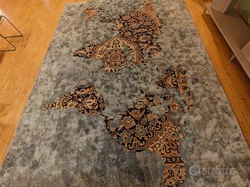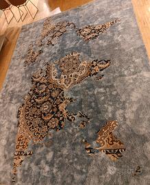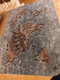 Un capolavoro tessile che fonde arte e design: tappeto esclusivo in lana e viscosa, decorato con una mappa del mondo stilizzata e ricca di dettagli ornamentali. Ogni continente è interpretato con motivi sofisticati, su fondo grigio testurizzato che esalta la profondità e il carattere del pezzo.