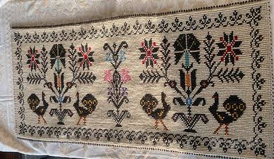 Tappeto/arazzo Sardo lavorazione tutto pieno fatto con telaio a mano , trama cotone e rilievo a pibiones in lana .