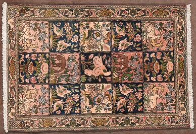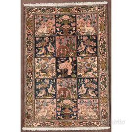 Tappeto antico annodato a mano di origine persiana, realizzato secondo la tradizionale tecnica tessile Bakhtiari. Presenta un design audace e strutturato, con motivi floreali e giardiniere suddivisi in riquadri regolari. Il fitto pelo in lana, le tinte naturali vivaci e il carattere tribale testimoniano la forza e l’abilità artigianale dei tappeti Bakhtiari della metà del XIX secolo.
