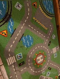 Tappeto Ikea Storabo 75x133 cm, con disegni di strade e laghi e parcheggi, ottimo per giocare. Fondo in gomma antiscivolo. Pelo corto. Ha qualche macchiolina ma è sempre stato tenuto bene, in camera, e aspirato regolarmente.