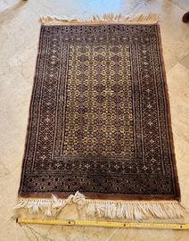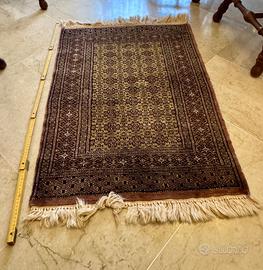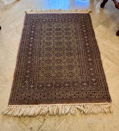 Vendesi splendido tappeto fatto a mano, tipologia Bokhara, dalle dimensioni contenute e ideali per rifinire un angolo studio, una camera da letto o come scendiletto di lusso. Il tappeto si distingue per la sua raffinata composizione in misto lana e seta, che dona al vello una lucentezza cangiante e una morbidezza al tatto superiore rispetto ai modelli standard in sola lana. Caratteristiche principali: Motivo: Classico disegno a "gül" geometrici su fondo bordeaux/terra di siena. Materiali: Lana di alta qualità con inserti in seta. Dimensioni: Lunghezza 83 cm (escluse frange) x Larghezza 60 cm. Stato: Ottime condizioni generali, vello compatto e colori vividi. Frange originali integre. Un pezzo d'arredamento elegante che si adatta perfettamente sia a contesti classici che moderni grazie ai suoi toni caldi e sofisticati.