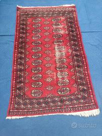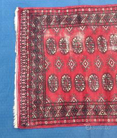 Tappeto bukara realizzato in Pakistan, annodato a mano, con segni di usura. Dimensioni: 152x95 cm.