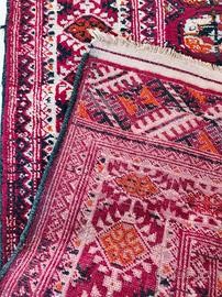 Tappeto Bukhara turkmeno originale degli anni '60, interamente annodato a mano. Misura 211 x 117 cm ed è caratterizzato dai tradizionali motivi geometrici “göl” su un elegante fondo rosso rubino intenso.