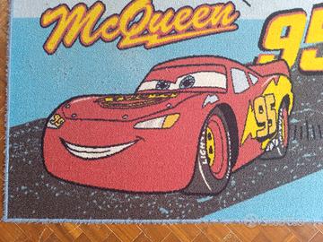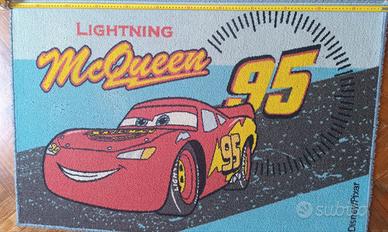 tappeto cameretta bambino Cars 120 cm lunghezza e 60 cm in altezza. sono un po' rovinati tre angoli come si vede in foto per il resto ancora è un buon tappeto .