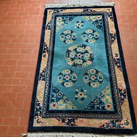 Vendo elegante tappeto cinese di grandi dimensioni, caratterizzato da un raffinato fondo blu con motivi floreali disposti in medaglioni circolari. Il bordo presenta un classico disegno geometrico e floreale tipico della produzione cinese, con colori armoniosi e ben bilanciati. Le frange sono presenti su entrambi i lati corti.