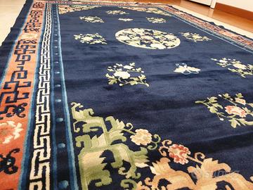 L'esemplare in oggetto, che misura m. 1,55 x 2,50, è un classico tappeto cinese del tipo Pechino antique finish della seconda metà del '900, definito così perché annodato seguendo gli stilemi e le rifiniture delle antiche produzioni di Pechino o Bejing. Questo bel tappeto ha il classico fondo (ordito e trama) di cotone con vello (annodatura) in ottima lana lucida e molto soffice.