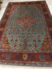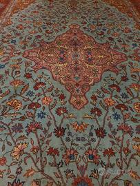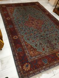 Vendo grande ed elegante tappeto dal fascino orientale, caratterizzato da un ricco decoro floreale con medaglione centrale e il suggestivo motivo del "vaso della vita" alla base. Un elemento d'arredo di grande impatto visivo, perfetto per scaldare e impreziosire un salotto, un'ampia camera da letto o uno studio elegante. Caratteristiche: Design: Stile classico persiano, con un bellissimo e raffinato contrasto tra il campo centrale sulle tonalità dell'azzurro/verde acqua e le ampie cornici nei toni del rosso e bordeaux. Dettagli: Motivi fitti e particolareggiati, completo di frange chiare alle estremità. Condizioni: Estetiche: In ottimo stato di conservazione, come da foto. I colori sono ancora molto vividi, il vello è morbido e la trama è integra. Non ci sono strappi o macchie. Conservato con grande cura. Ritiro a mano a Torino (zona Santa Rita). Prezzo trattabile. Disponibile per altre foto