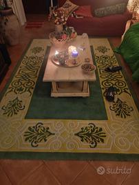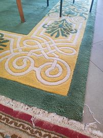 PRODUZIONE EUROPEA 1980 ca. Tappeto in lana a campo verde con cornice decorata a motivi neoclassici giallo, oro e avorio. cm 300 x 200