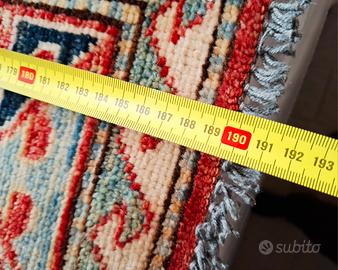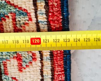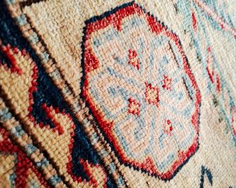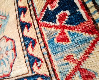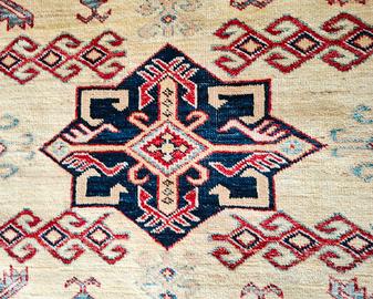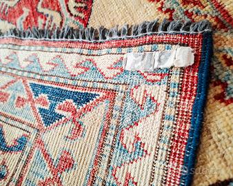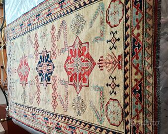 Ampio tappeto su base beige con decorazioni geometriche e piccole frange. Ottime condizioni, misure in foto.