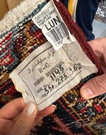Caratteristiche Principali: • Origine: Autentico artigianato iraniano (Persia). • Lavorazione: Interamente annodato a mano, come certificato dall'etichetta originale "Iranian Handicraft". • Dimensioni Generose: 350 x 275 cm (circa 9,62 mq), ideale per saloni ampi, sale da pranzo o camere padronali. • Design e Colori: Motivo geometrico ricco e dettagliato con una palette cromatica calda dominata dal rosso porpora, con accenti in blu notte, crema e ocra. La complessità dei decori testimonia l'abilità dei maestri tessitori. • Materiali: Lana di alta qualità su trama robusta, che garantisce morbidezza al tatto e una lunga durata nel tempo. Perché sceglierlo: Oltre a essere un complemento d'arredo di grande impatto visivo, un tappeto persiano di queste dimensioni rappresenta un piccolo investimento nel tempo. È stato recentemente gestito da professionisti del settore (come indicato dal sigillo "Carpets Wash"), assicurandoti un prodotto pronto per essere posizionato in casa