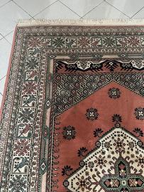Vendo bellissimo tappeto da salotto di grandi dimensioni (250 x 150 cm). Il tappeto presenta un classico motivo orientale con medaglione centrale geometrico e decorazioni floreali. I colori predominanti sono il color terracotta/salmone, con dettagli in nero, panna e verde salvia.