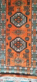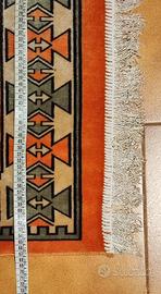 Tappeto decorato con medaglioni geometrici e bordure intricate.