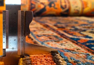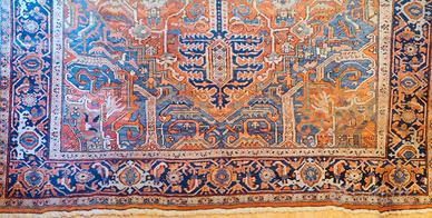 Tappeto Heriz provenienza Persia, epoca 1940, ottimo stato conservativo con testate e bordure originali e complete. Vello integro. Trama ed ordito in cotone, annodato interamente in lana. Dimensioni: metri 3,95x2,93 Venduto pulito. Claire