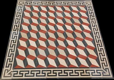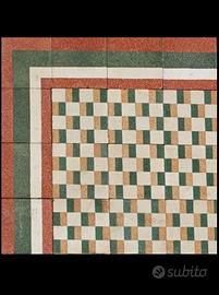 La nostra Azienda, sita in prov. di Benevento, è impiegata nella fornitura di materiali edili d'epoca da reimpiegarsi nelle ristrutturazioni e restauri conservativi. Nell'annuncio proponiamo alcune pavimentazioni in cementine d'epoca di medie dimensioni. Foto 1 e 2: Favoloso tappeto di cementine d'epoca da figure geometriche proiettate in prospettiva. Si estende per mt 2,50x2,50, totale 6,25 mq. Foto 3,4: Splendido tappeto in graniglie d'epoca nei toni del verde, bianco e rosso. Si estende per mt 2,40 x 2,40. Tot. mq 5,76.
