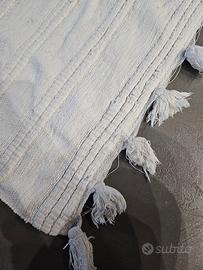 Vendo tappeto in cotone color bianco con frange, dimensioni 190x120 cm. Stile semplice e versatile, adatto a soggiorno, camera o casa vacanze. Il tappeto è usato e già lavato e in buone condizioni, come da foto. Leggero e facile da lavare.