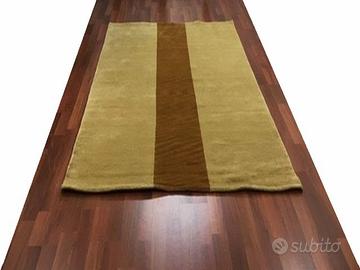FUORI TUTTO PREZZI ECCEZIONALI Tappeto di lana 100% modello TWIN, di un colore di una calda tonalita' beige/camel con una striscia centrale di un colore sul marrone bruciato che armonizza il tutto. Un morbido tappeto in lana dona calore ad ogni casa in modo assolutamente piacevole e naturale. Con queste premesse i tappeti di lana rappresentano dei complementi ideali per la camera da letto e il salotto. Per un tappeto per cucina o dei tappeti outdoor risultano essere invece più adatte fibre sintetiche, come il polipropilene. Le fibre di lana, in virtù della loro struttura flessibile, presentano buone proprietà termoregolatrici. Attraverso la loro struttura vaporosa sono in grado di trattenere l’umidità, rilasciandola poi in un secondo momento. Una ragione in più per l’acquisto di un tappeto di lana è costituita dalla sua abilità di regolare spontaneamente il clima di un ambiente, neutralizzando in aggiunta i cattivi odori. Tutte queste doti rendono la fibra di lana semplicemente perfetta per la fabbricazione di tappeti. Essendo molto elastica, ma al contempo stabile, riesce sempre a ritrovare la propria forma originaria anche dopo essere stata sottoposta a pesanti carichi; nemmeno la presenza di pesanti mobili sulla superficie del tappeto potrebbero alterarne la struttura. La resistenza allo sporco rende i tappeti in lana assolutamente ideali per l’arredamento degli interni.