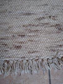 tappeto in lana beige chiaro con chiazze di marrone scuro. presenta frange sui lati minori. Misura 130x200.