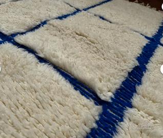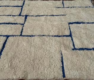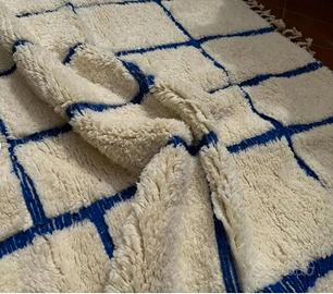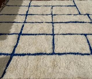 Ogni tappeto è tessuto a mano con lana di pecora 100% naturale da donne berbere qualificate nelle montagne dell'Atlante in Marocco. La sua base di avorio delicato è splendidamente contrastata da audaci linee geometriche blu, conferendole un aspetto pulito, moderno e senza tempo. Che il vostro spazio sia bohemien. I nostri tappeti vengono spediti direttamente dal Marocco.