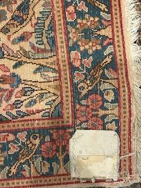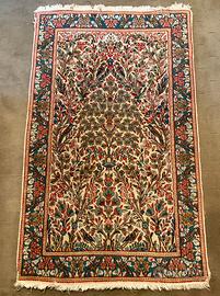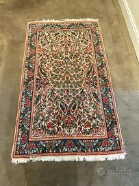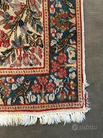 Quesyo è un tappeto persiano autentico, è stato comprato un importante negozio che tutto resiste a Brescia e caratterizzato dal celebre motivo decorativo "Albero della Vita misura 160 cm per 90 Cm Idi Kashan o Qum Soggetto: Il tema centrale dell'Albero della Vita è circondato da una ricca fauna selvatica, con uccelli variopinti tra rami fioriti, simboleggiando vita e fertilità. Materiali: Questi tappeti sono solitamente realizzati in lana Kurk pregiata si utilizza solo la Ghana del coro della pecora Colori: Il fondo avorio (o beige chiaro) fa risaltare le tonalità floreali e le elaborate bordure, elementi distintivi dello stile classico persiano. È un classico tappeto che parte degli arredi di una casa borghese era di mia mamma e secondo me non c'è mai imprestato nessuno erano usati come scendi letto Kashan: Celebri per i loro disegni classici con medaglioni centrali e motivi floreali, spesso su fondo rosso o blu. Qum (Ghom): Conosciuti per l'uso esclusivo della seta e una densità di nodi elevatissima, sono veri e propri oggetti di lusso. Isfahan: Considerati tra i più raffinati, presentano disegni estremamente dettagliati e simmetrici, ispirati all'architettura delle moschee. Tabriz: Una delle produzioni più variegate; si distinguono per il sistema di misurazione della qualità chiamato "Raj". Nain: Facilmente riconoscibili per i colori chiari (avorio, bianco, blu) e l'uso della seta per evidenziare i contorni dei fiori. Heriz: Tappeti robusti con disegni geometrici e un grande medaglione centrale, tipici della zona nord-ovest. No pechinese Pechino no cina no moquette