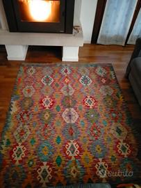 Tappeto Kilim stile MODERNO in ottime condizioni, misure 190 x 159, tipologia senza pelo, disegno geometrico. Tappeto fatto a mano e dall'utilizzo estremamente versatile: può essere utilizzato anche come arazzo. Colori perfetti e molto definiti. Euro 250