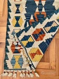 Tappeto kilim a tessitura piatta con motivi geometrici multicolori. Misure 63 x 123 cm